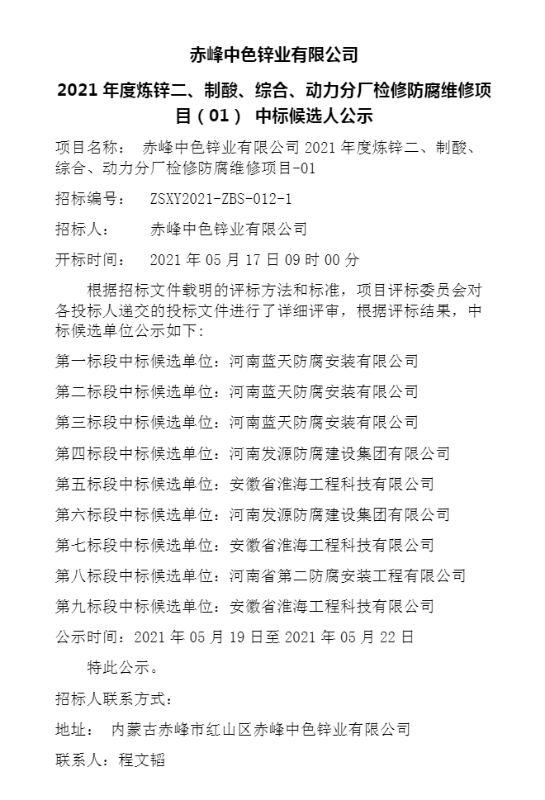 赤峰中色锌业有限公司2021年度炼锌二、制酸、综合、动力分厂检修防腐维修项目01中标候选人公示