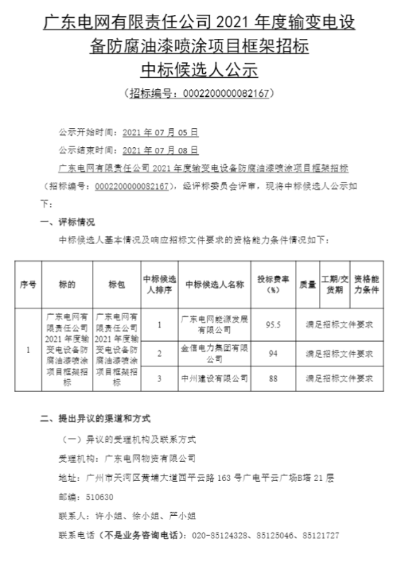 广东电网有限责任公司2021年度输变电设备防腐油漆喷涂项目框架招标结果公示