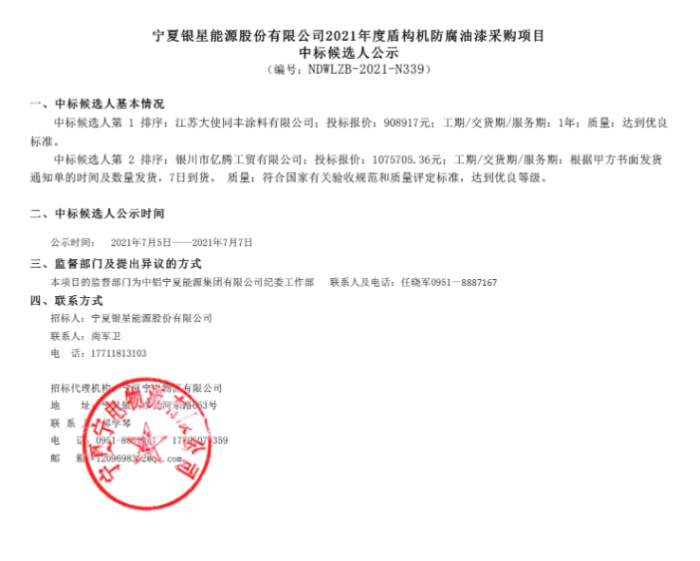 宁夏银星能源股份有限公司2021年度盾构机防腐油漆采购项目中标候选人公示