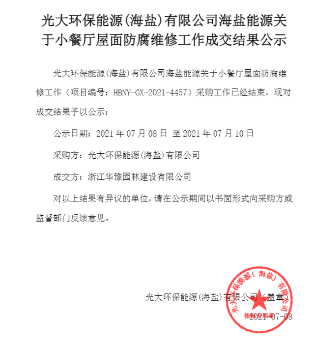 光大环保能源(海盐)有限公司海盐能源关于小餐厅屋面防腐维修工作成交结果公示