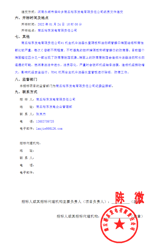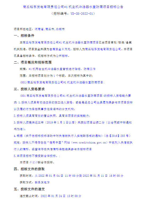 商丘裕东发电有限责任公司#1机主机冷油器水室防腐项目招标公告