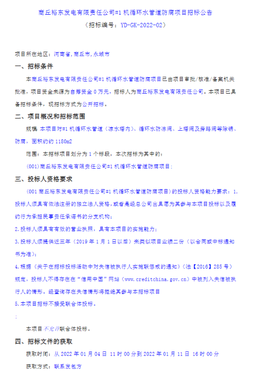 商丘裕东发电有限责任公司#1机循环水管道防腐项目招标公告
