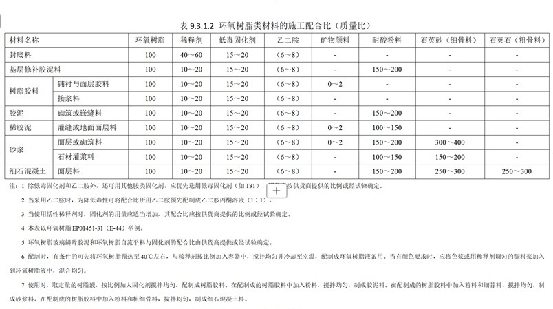 9.3.1.3 改性环氧树脂胶料的配制环氧树脂胶泥采用的改性方法多为酚醛树脂改性环氧树脂胶泥、呋喃树脂改性环氧树脂胶泥、煤焦油沥青改性环氧树脂胶泥。酚醛树脂改性环氧树脂胶泥用以提高后者的耐热性能。呋喃树脂改性环氧树脂胶泥用以提高后者的耐热、耐酸碱性能。煤焦油沥青改性环氧树脂胶泥用以提高后者的耐水、软性,降低成本。常见的改性环氧树脂类材料的施工配合比见表9.3.1.3。