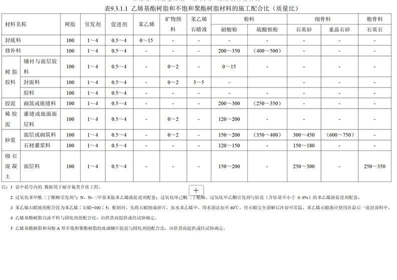 表9.3.1.5 呋喃树脂类材料的施工配合比(质量比)材料名称呋喃树脂糠醇糠醛型石英砂石英石玻璃纤维增强塑料粉胶泥粉砂浆粉混凝土粉 封底料[/td][td=7,1,1055]同环氧树脂、乙烯基酯树脂或不饱和聚酯树脂封底料修补料[/td][td=7,1,1055]同环氧树脂、乙烯基酯树脂或不饱和聚酯树脂修补料玻璃钢树脂胶料10040~50-----树脂胶泥砌筑100-250~400----灌缝100-250~300----树脂砂浆100--400~450---100----200~400-树脂混凝土100---250~300100~150400~500100----100~200400~500100----150~250250~400
