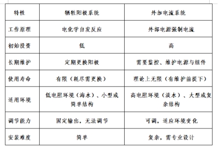 平衡点:在稳定的海水环境中,两者皆可,用规模做决定。在淡水、土壤或变化的环境中,外加电流通常是更可靠的选择。