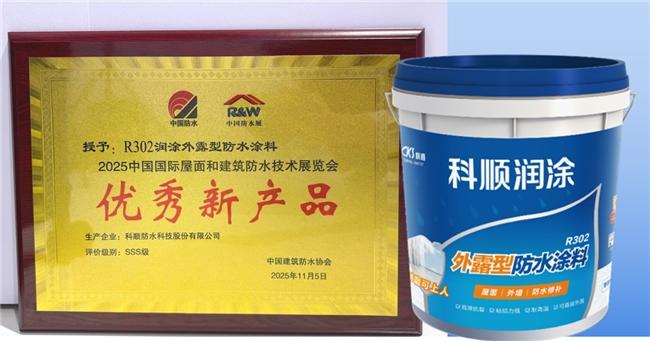 近日,在刚刚结束的2025年中国国际屋面和建筑防水技术展览会上(简称:中国防水展),科顺股份(股票代码:300737)旗下明星产品——科顺润涂R302外露型防水涂料,凭借其卓越的耐久性和可靠的防护效果,完美诠释科顺防水“一次防水,一次就好”的品牌承诺,成功斩获中国建筑防水协会最高级别的 SSS级“优秀新产品大奖” 。这一权威认可,标志着科顺以技术创新实现“长效免维护”的防水解决方案获得行业 最 高 赞誉。