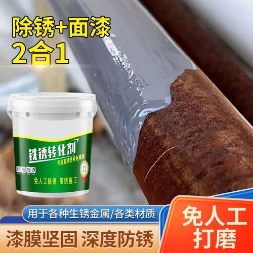 防锈工艺前处理目的就是清理钢铁表面氧化层、锈蚀层、油污及其他杂质,为后续防腐涂层创造干净而又具有一定附着力的良好基面。一般钢铁基层前处理工艺有:机械除锈(如钢丝轮打磨、喷砂和抛丸),化学除锈(如酸洗、钝化和磷化),激光除锈(热效冲击波),干冰除锈(深冷膨化)等方法;但是这些方法总是不尽人意,缺陷越来越明显,如钢丝轮打磨、喷砂和抛丸污染环境,效率不高;化学除锈污染环境,有害身体健康;激光除锈设备投入成本高,潜在热损伤风险;干冰除锈成本高效率低,适用场景受限。为改变这一现状,工程技术人员经过长期实践摸索和材料研究,开发出一种既能免除锈又可以实现腐蚀控制的环保友好型前处理材料(不限于前处理功能)----转锈产品。这种转锈产品一经问世便受到防腐界施工人员的青睐,并大量应用于钢铁防锈工艺的基层前处理。这种免除锈产品改变了传统的强制性除锈去锈的工艺方法,而是“转锈为宝”将铁锈转化为有益的致密性防腐层。目前流行于市场的免除锈产品包括“锈转化剂”和“带锈涂料”两种,前者属于单一的表面处理免除锈工艺;而后者则是具有免除锈前处理和涂装工艺合二为一的双效功能。“锈转化剂”需要配合底涂、面涂实现长效的防锈控锈目的;而“带锈涂料”直接达到防腐效果。因此,“带锈涂料”应用起来一步到位,节约劳动力和工时,满足高效低成本施工要求,被称为“防锈一步法”工艺。